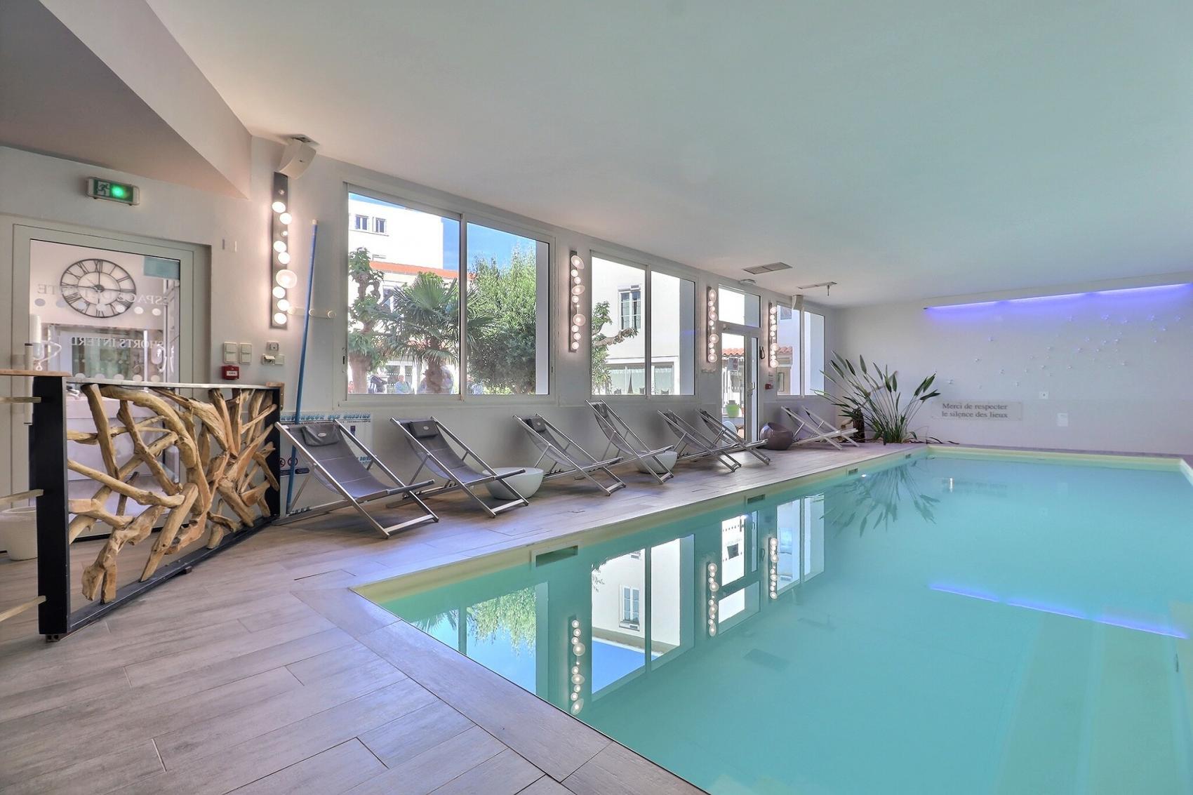 Notre espace détente composé d'une piscine chauffée à 29° (avec nage à contre-courant et balnéothérapie), d'un sauna et d'un hammam est ouvert tous les jours de 10h à 20h.